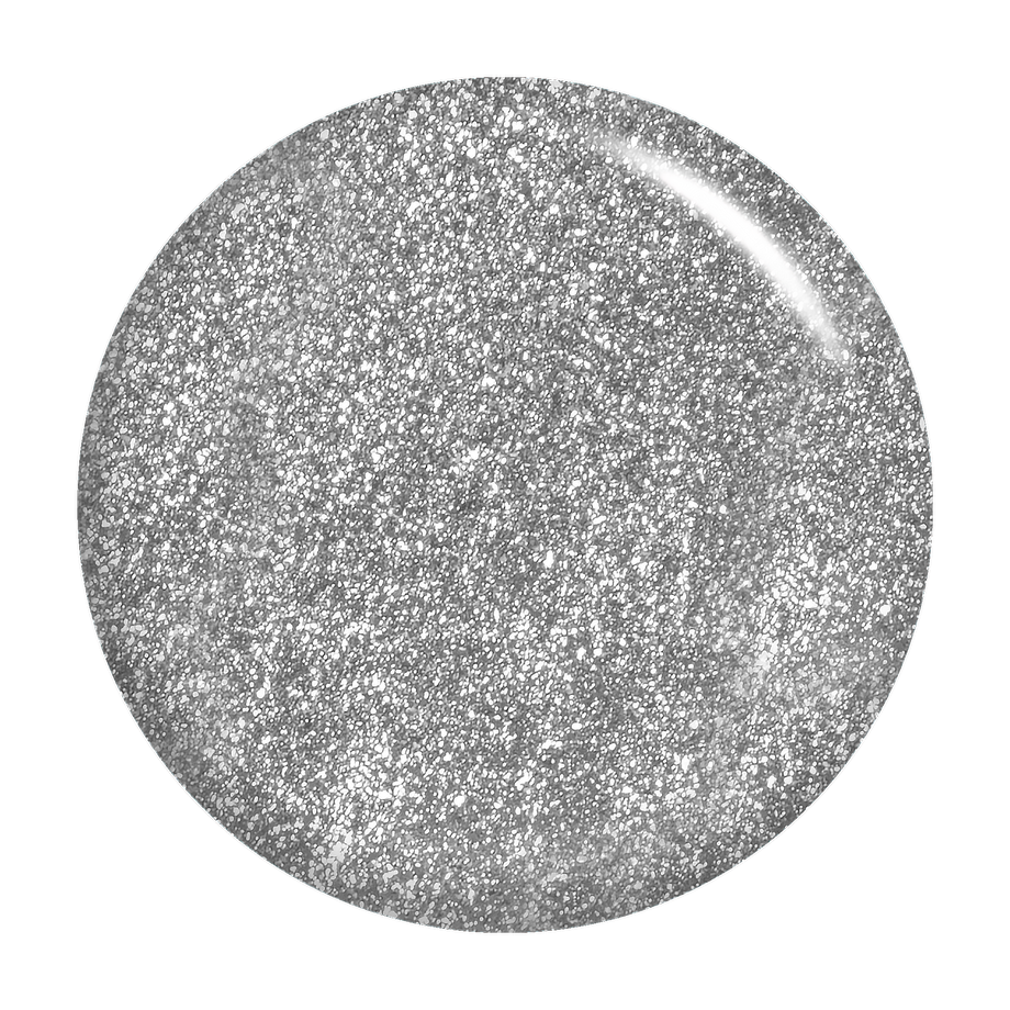 Silver. Metallic foil sparkle. Opaque. Cool undertone.